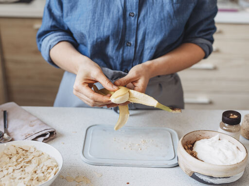 1. Bananas are the ideal grab-and-go snack. They provide a natural source of carbohydrates and fiber that helps slow digestion. One medium banana provides 105 calories and 27 grams of carbohydrates. Bananas contain a 1:1 ratio of glucose to fructose, a sugar profile our previous research has supported as ideal for athletic performance. Try throwing one in a smoothie to take on the go!
