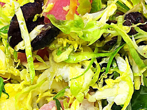 - Add the sliced Brussels sprouts, olives, parsley and marjoram and toss to coat in the dressing.