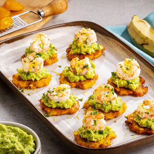 Avocado Shrimp Tostones with Salt Cured Egg Yolk