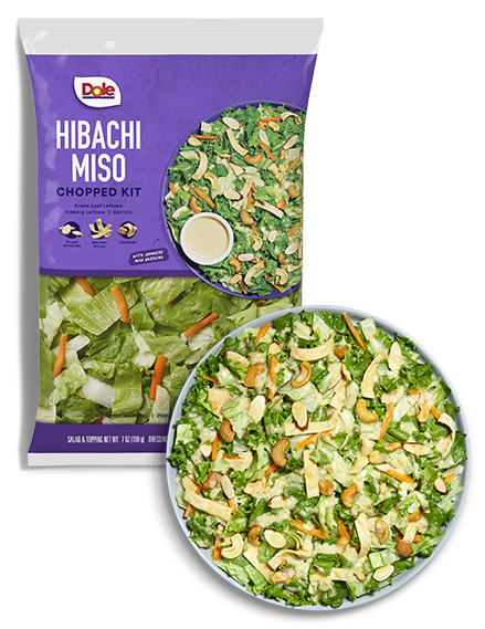 Chop Chop! Our Hibachi Miso salad captures the Exciting Flavors of a Japanese Hibachi restaurant, with its Vibrant Mix of Tastes and Textures, including crunchy cashews, sliced almonds, crispy wonton strips and the Savory Sesame flavors of our Japanese Miso dressing. It makes any meal a special occasion!
