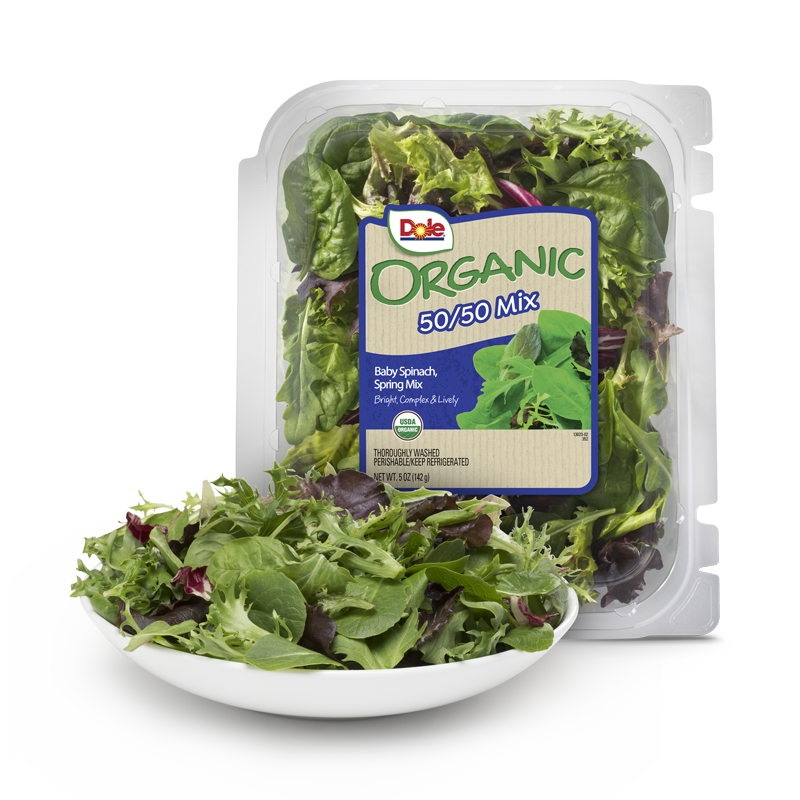 Organic 50/50 blend is a salad masterpiece: a robust and balanced blend of delicate baby greens and lettuces, including tender baby spinach, peppery radicchio and invigorating arugula and chard. This blend is nicely complemented by fresh herbs and finely sliced shallots.
