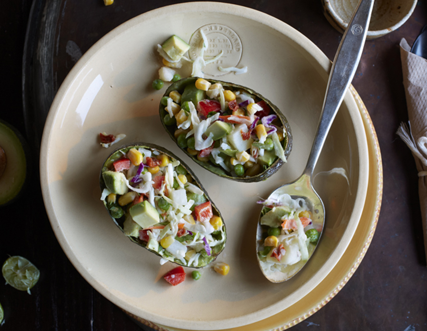 - Mix in avocados just before serving, to prevent browning. Serve in shallow bowls or scooped out avocado skins for a more festive presentation.