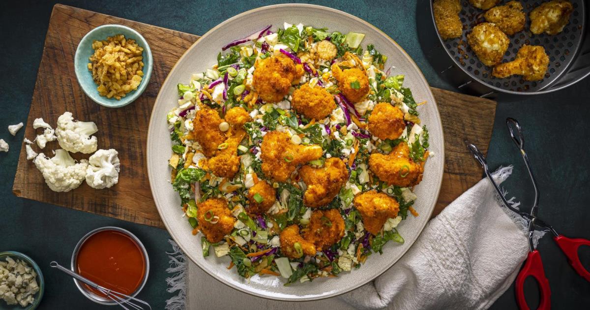 - Whisk hot sauce and buttery spread in a large bowl; add cauliflower and toss. Prepare Chopped Kit as package directs in a large bowl. Makes about 3 cups.