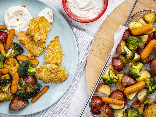 6. Serve chicken nuggets with yogurt mixture and vegetables.