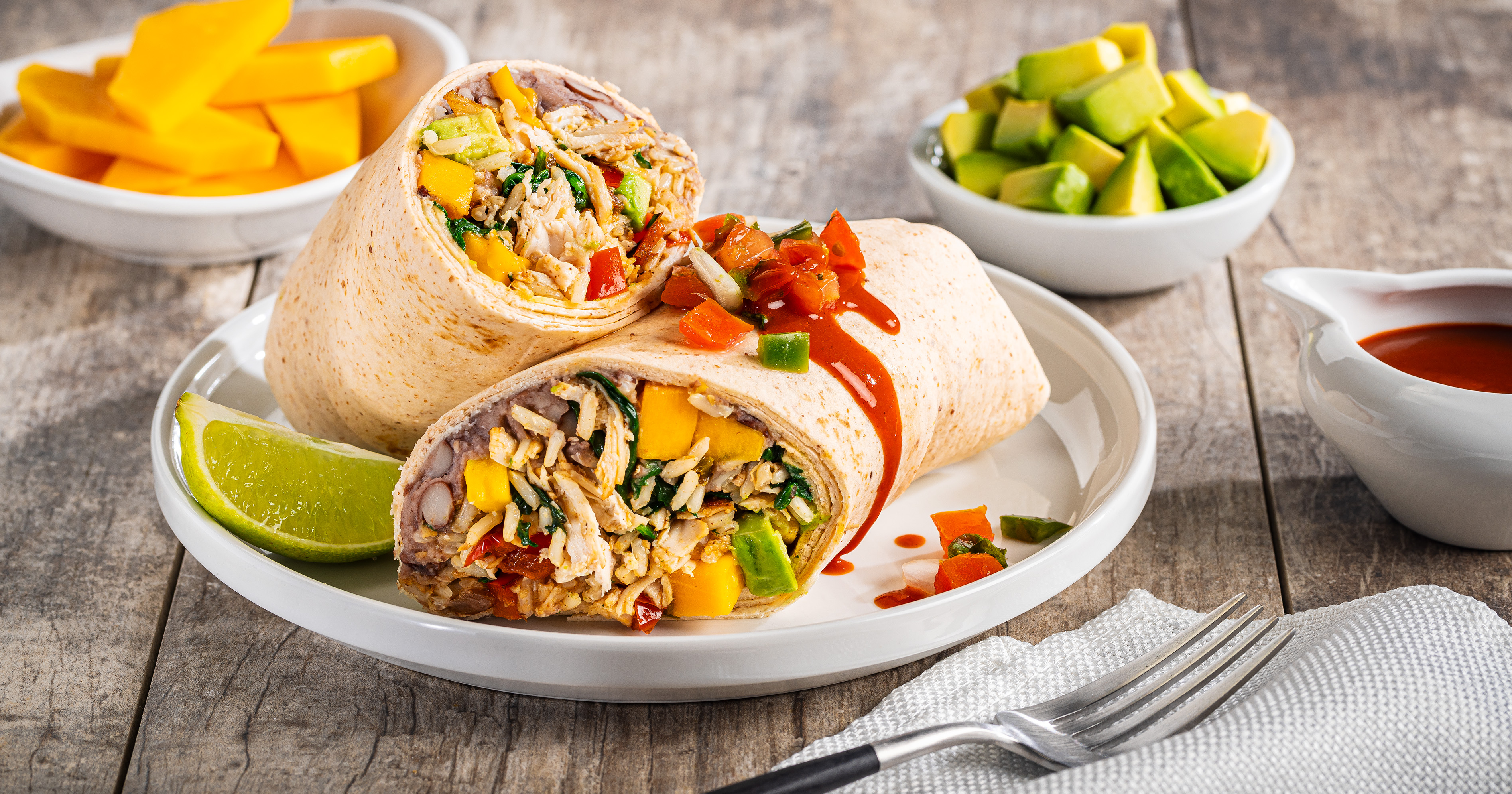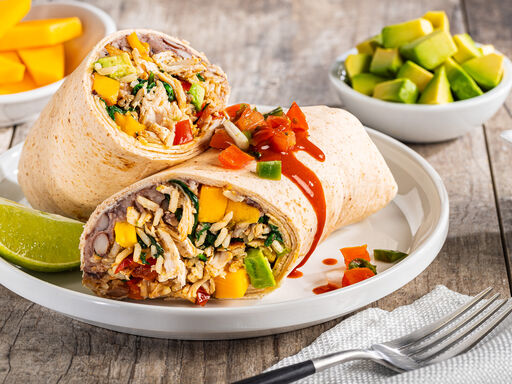 3. Heat tortillas as label directs. Working with 1 tortilla at a time, spread about 1/4 cup beans down center of each tortilla; top with 1/4 cup rice, 2/3 cup turkey mixture, avocados and mango. Fold sides of tortilla over filling and roll up burritos. Makes 6 burritos.