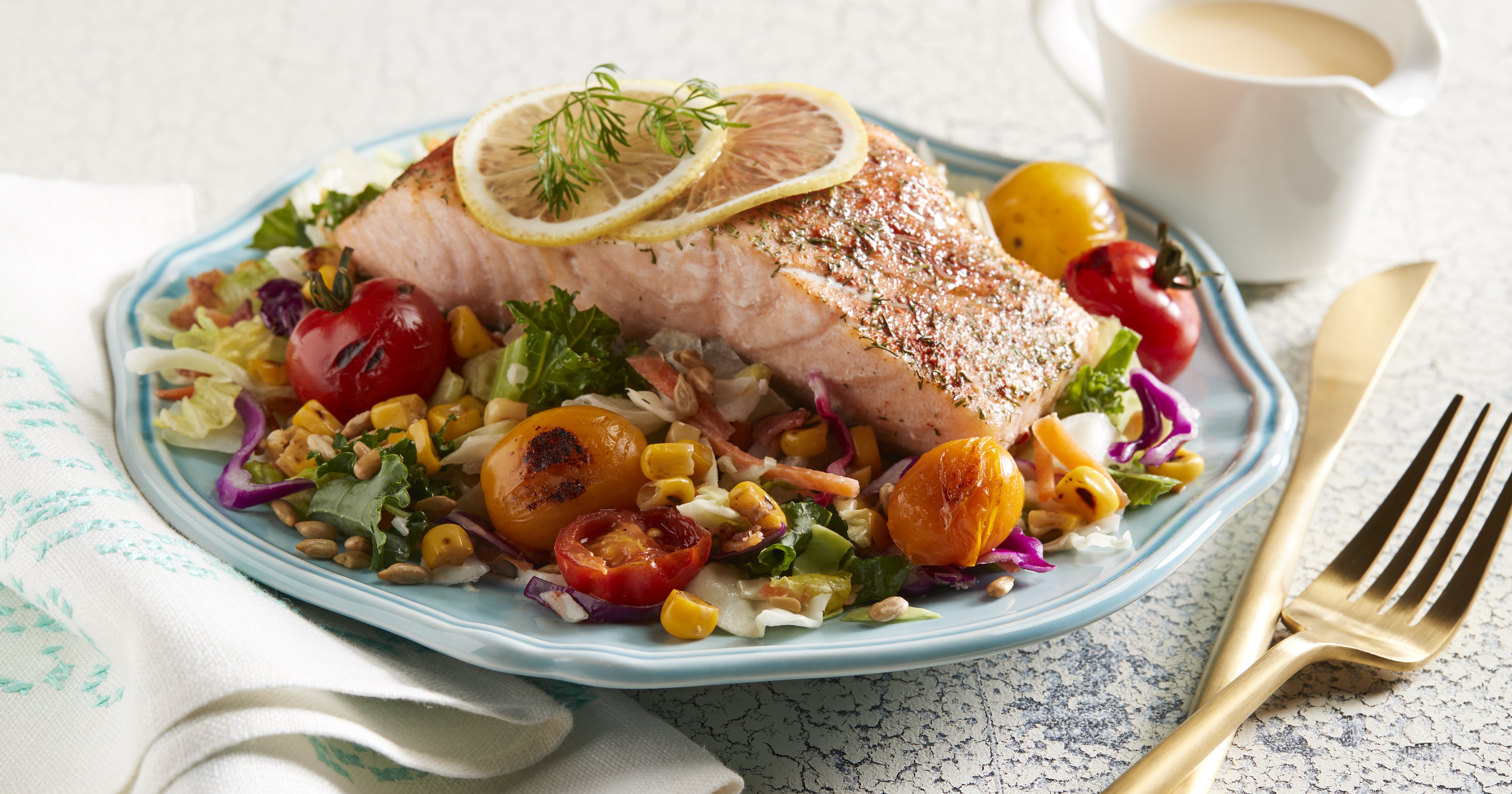 - Pour salad kit ingredients into bowl and toss together with coleslaw. Stir in tomatoes and corn, toss to coat. Divide salad mixture onto plates and top with baked salmon.