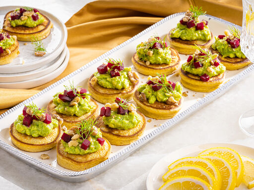 4. Top blini with avocado mixture, beets, walnuts, dill and/or mint; serve immediately.