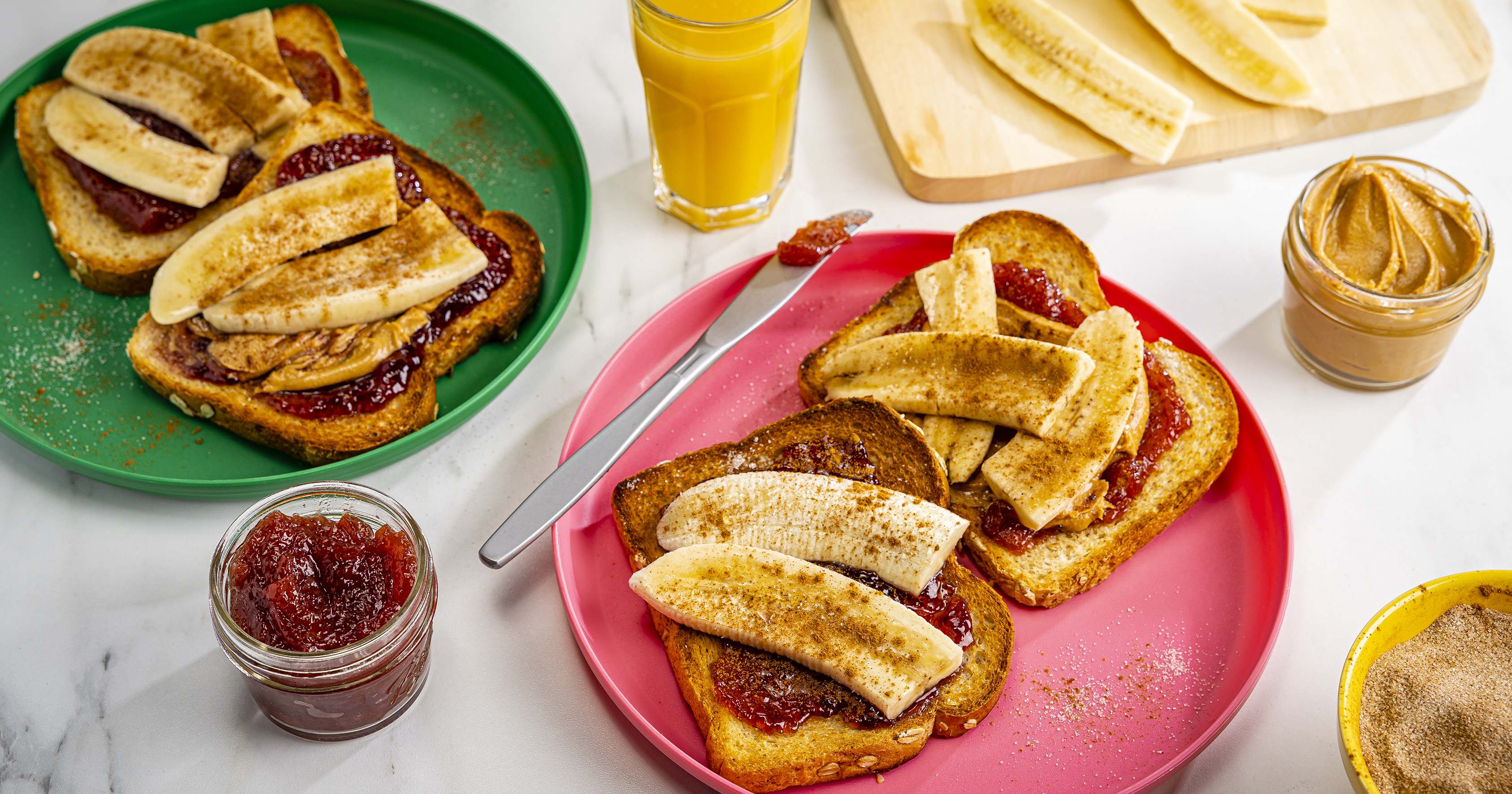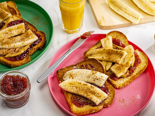 - Spread each slice of bread with fruit spread. Top with 2 banana pieces for an open-faced sandwich. Sprinkle with cinnamon and sugar, if desired.