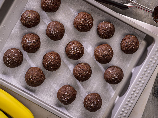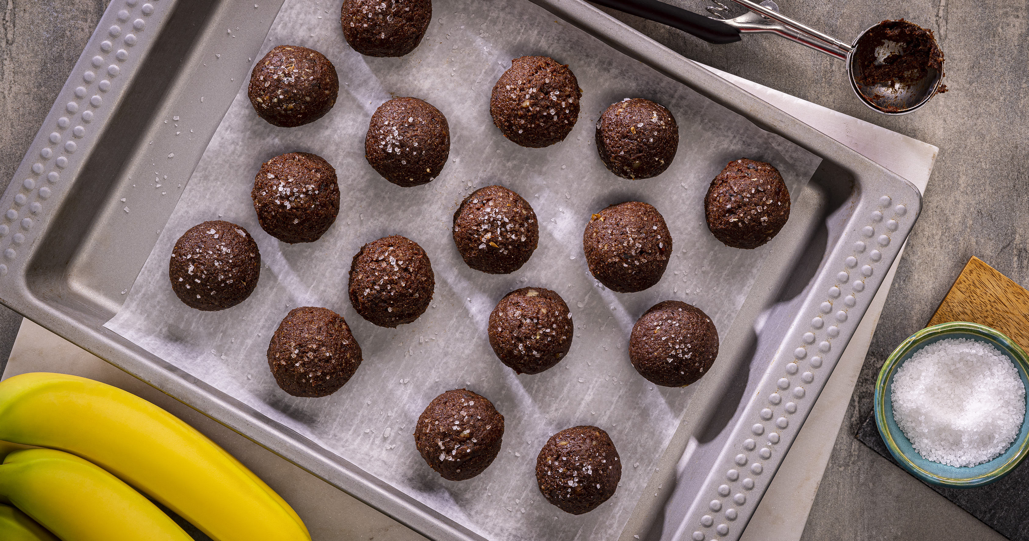 2. Using 2 small spoons, drop date mixture into 16 (1¾-inch) mounds on prepared pan; roll mounds into balls. Sprinkle balls with salt; refrigerate 1 hour or until firm. Makes 16 energy bites.