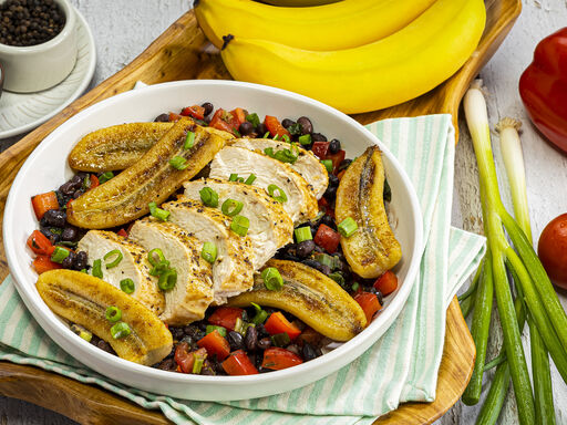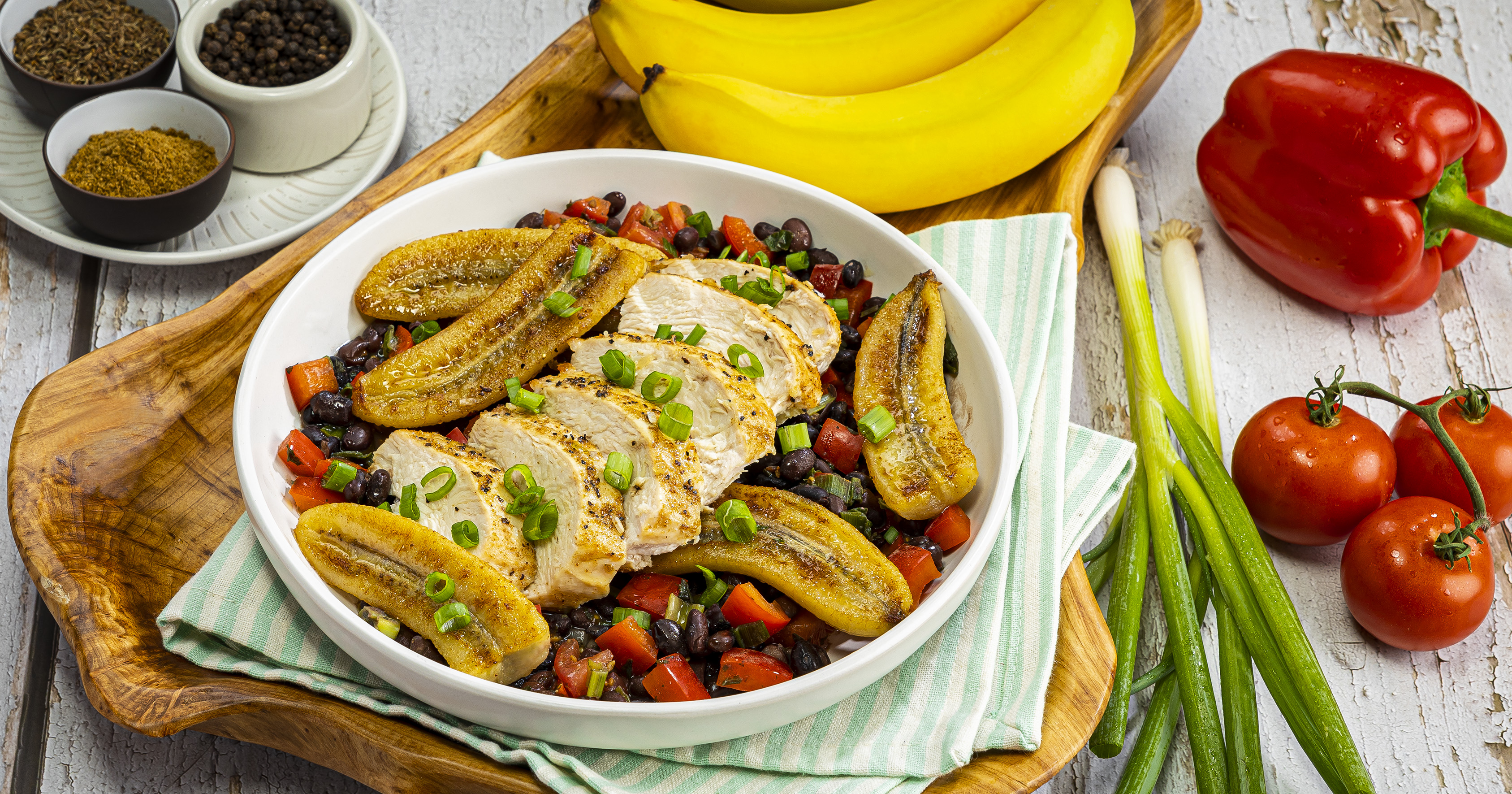 - Cut bananas in half crosswise, then lengthwise into 4 pieces. Rub chicken with garlic; sprinkle with salt and pepper to taste. Sprinkle 1 teaspoon cumin over chicken and bananas. In non-stick skillet, brown bananas in 1 tablespoon oil on both sides (2 to 3 minutes). Keep warm.