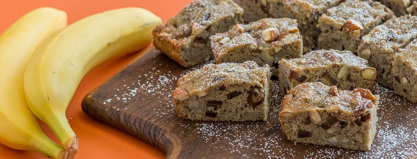 - Beat sugar and margarine in large bowl until light and fluffy. Beat in egg and lemon peel. Beat in flour mixture alternately with pureed banana. Stir in almonds, dates and chopped banana.