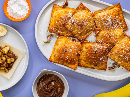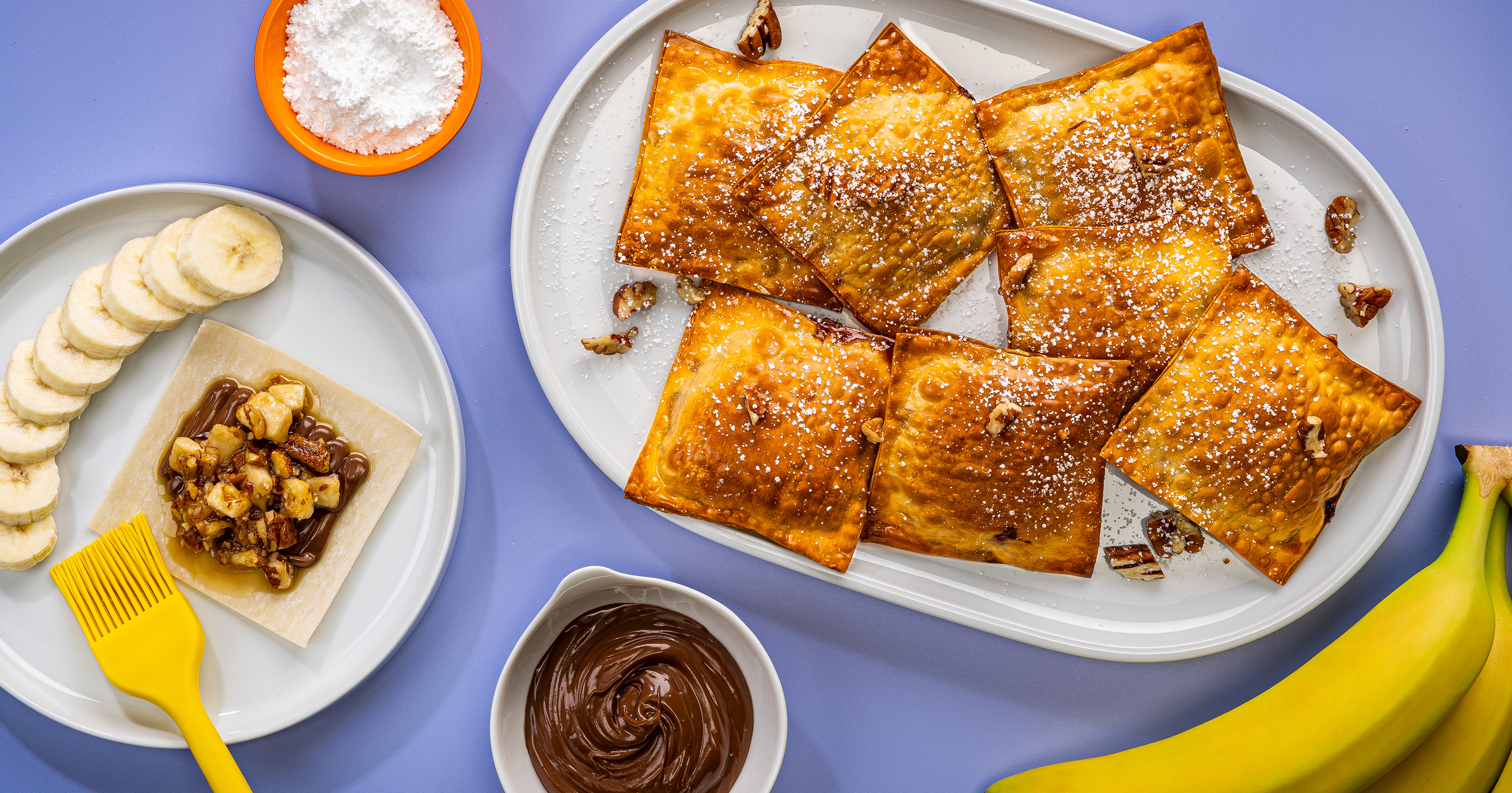 2. Place wrappers on work surface with 1 corner of each facing you. Place about 2 teaspoons hazelnut spread in center of 8 wrappers; top with 1 tablespoon banana mixture. Brush edges of wrappers with some egg; top with remaining 8 wrappers and seal edges with additional egg, if necessary.