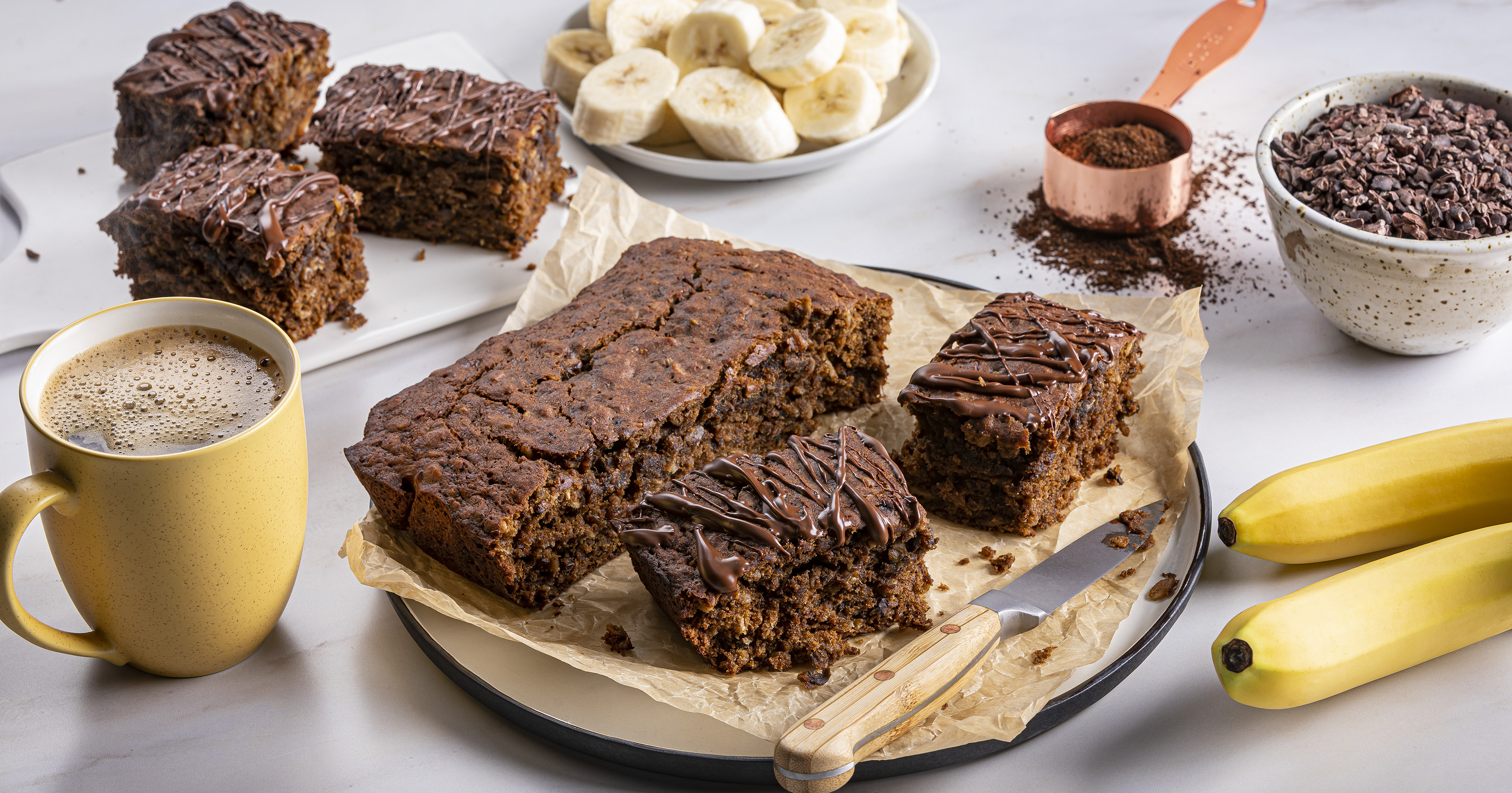 - Mash bananas with the back of a fork in a large bowl; whisk in egg, oil, sugar, 2 tablespoons coffee, vanilla extract and salt. Stir in oats, flour and baking soda; fold in cocoa nibs. Spread banana mixture in prepared dish; bake 25 minutes or until golden brown and center is set. Cool completely.