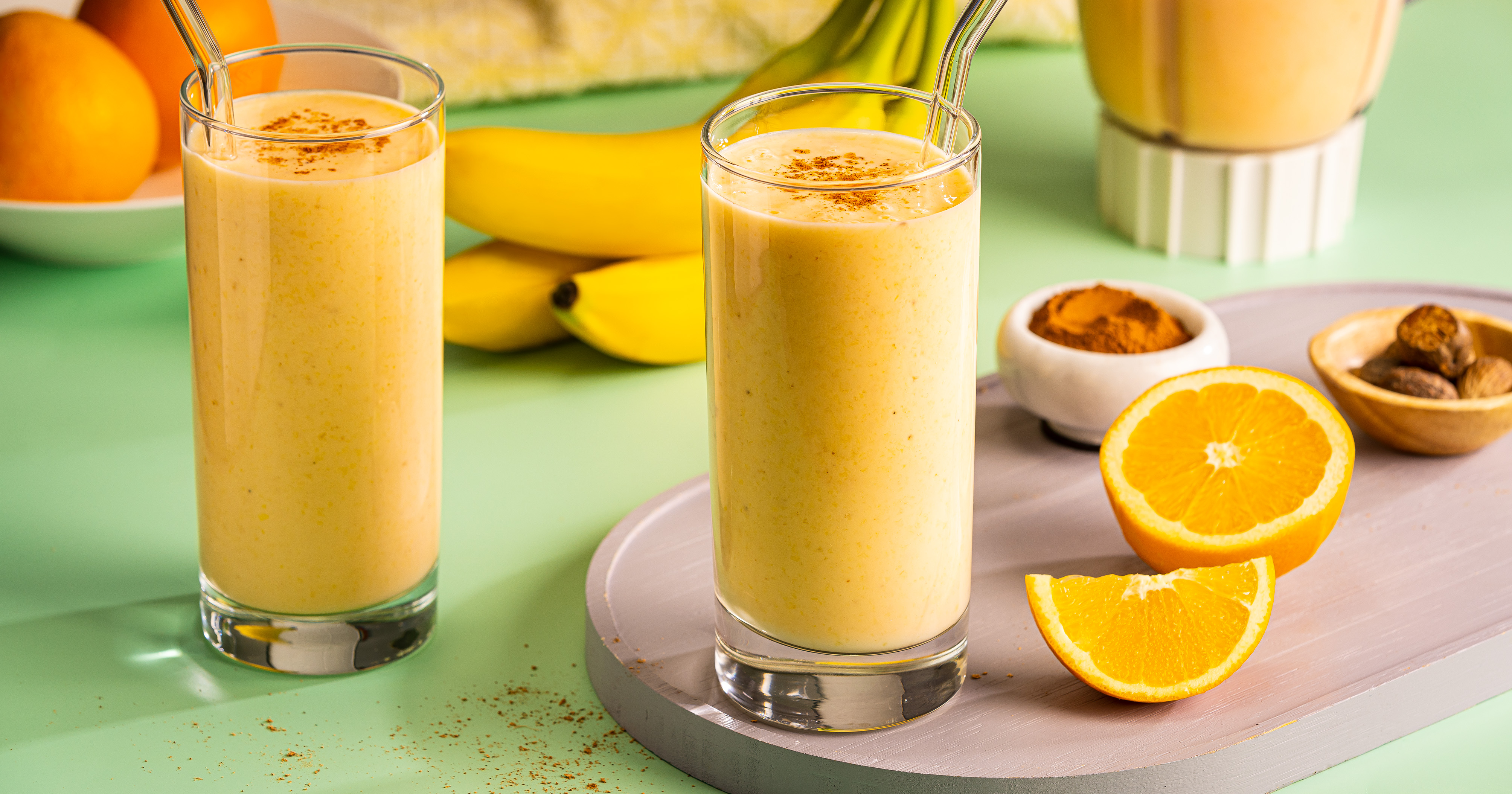 1. Purée oranges, bananas, yogurt, cinnamon and nutmeg in a blender on high until smooth.
