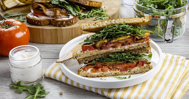 - Toast bread. Spread mayonnaise over 4 bread slices; top with tomato, arugula, Banana Peel Bacon and remaining 4 bread slices.