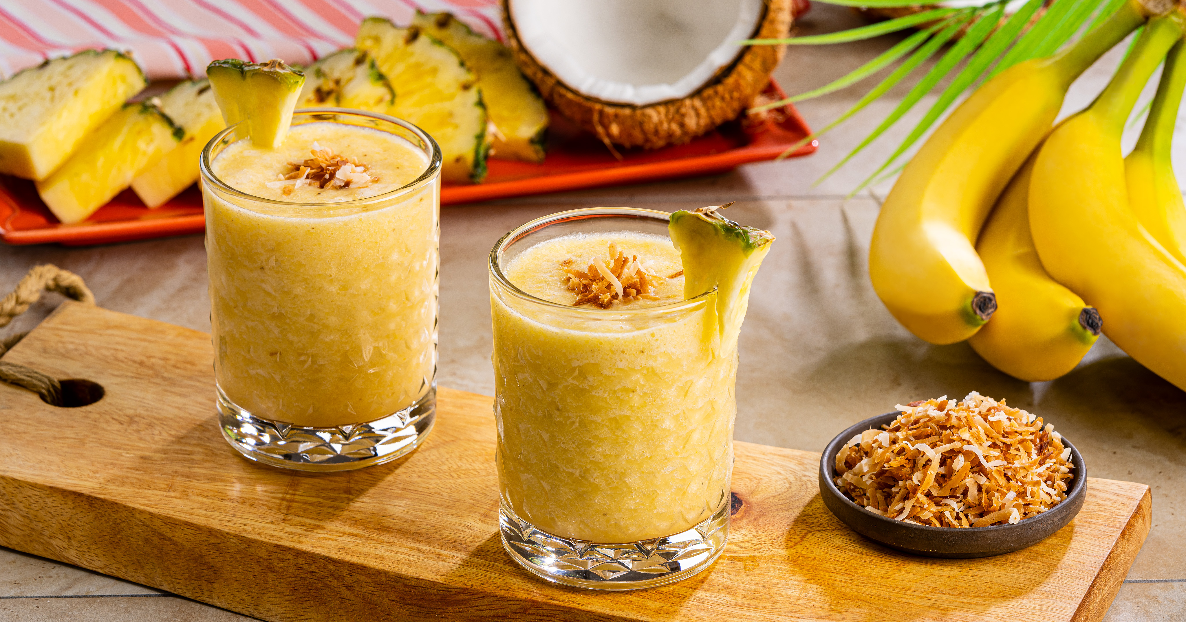 1. Purée bananas, pineapple, almond milk, ice and coconut, if desired, in a blender on high until smooth.