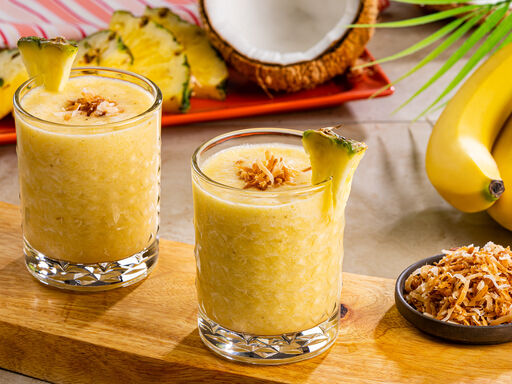 2. Serve smoothies garnished with pineapple and/or coconut, if desired. Makes 2 smoothies.
