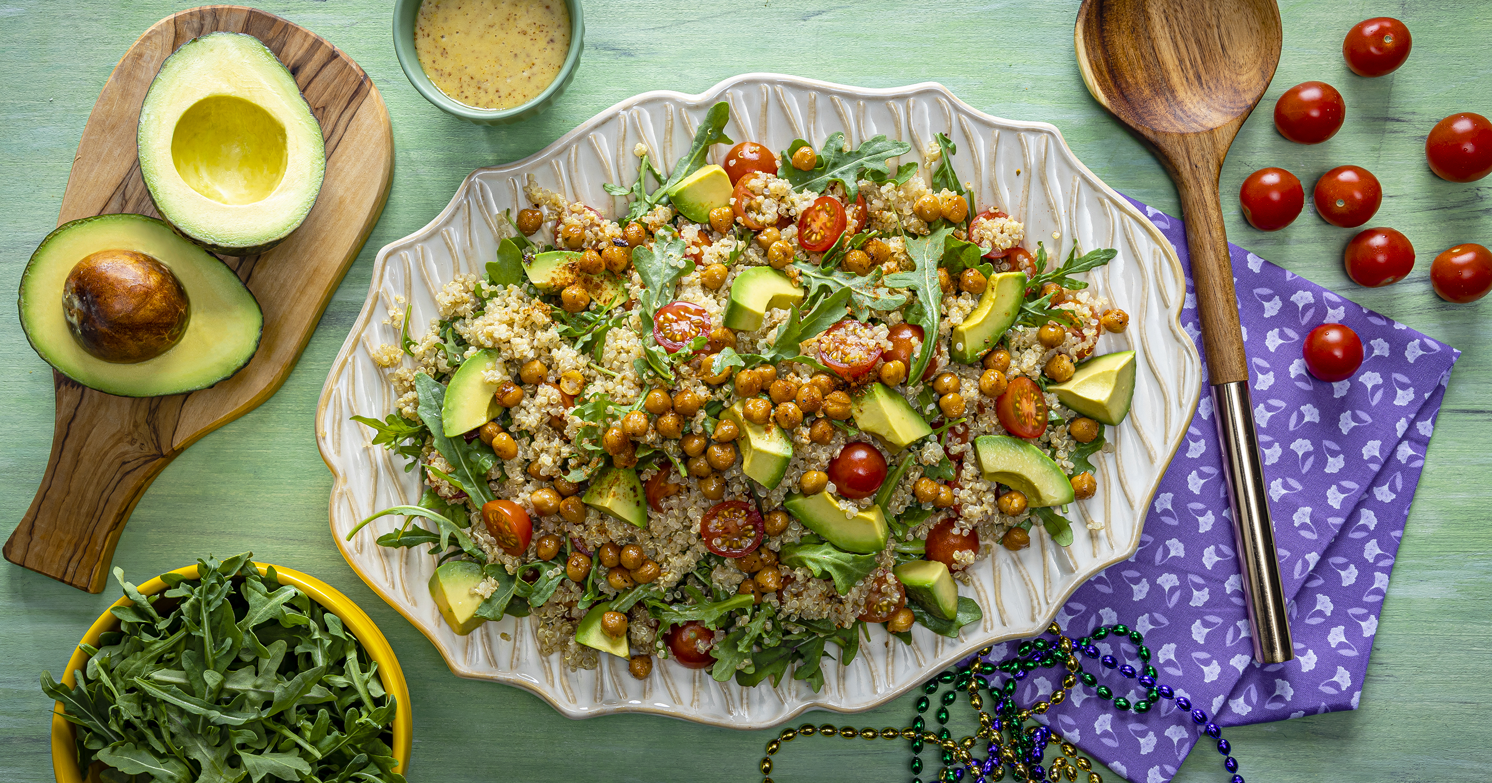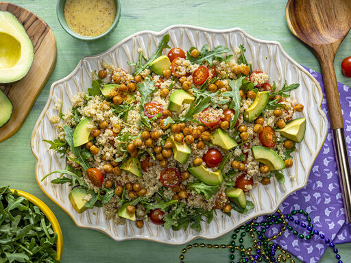 - Whisk mustard, honey, vinegar, salt and remaining 1 tablespoon oil in a large bowl; fold in avocado, arugula, tomatoes and quinoa. Makes about 6 cups.