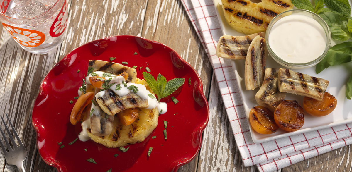 - Remove pineapple from grill and place onto four plates. Top pineapple with remaining fruit.