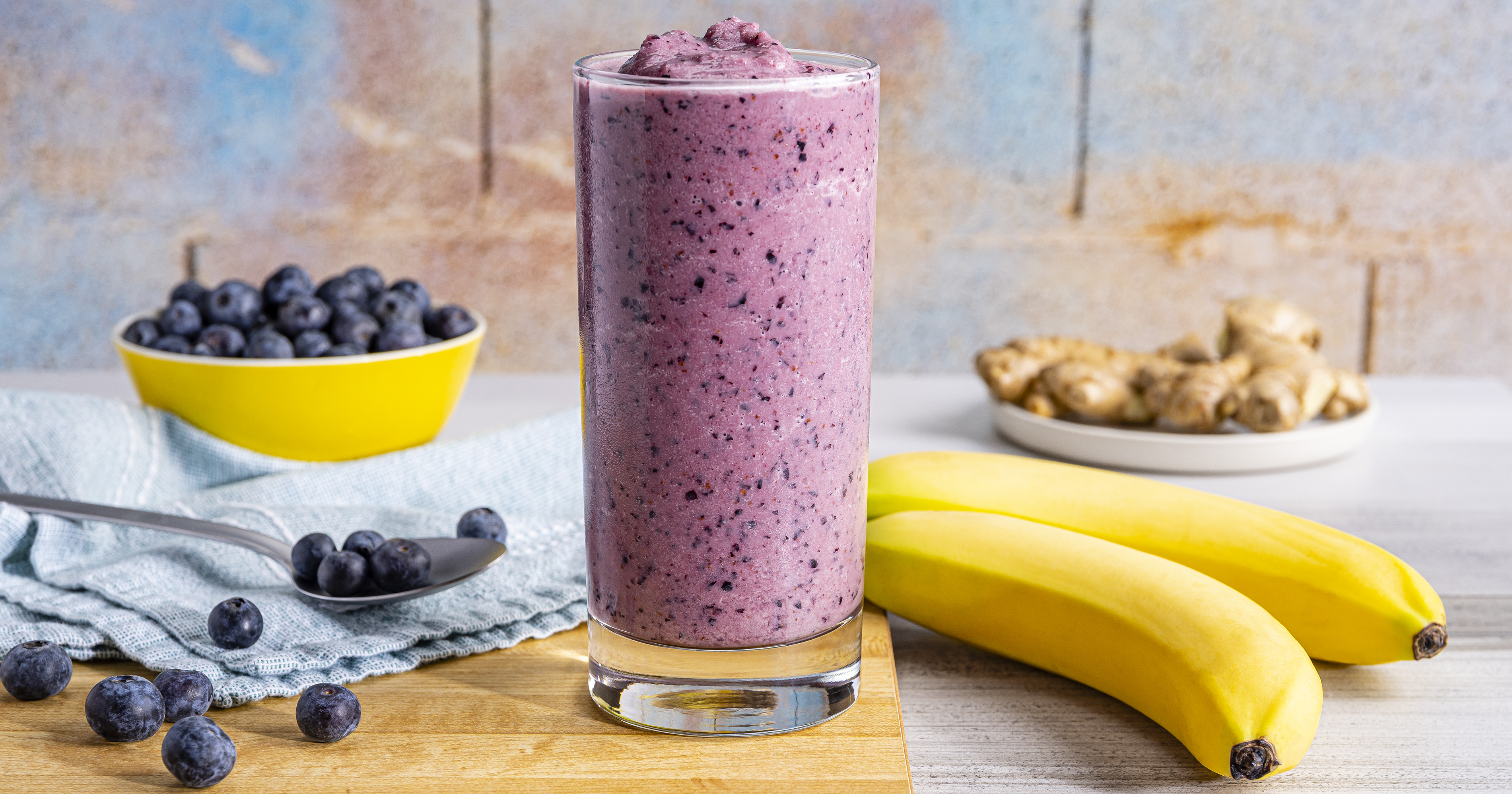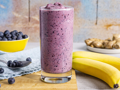 - Combine banana, blueberries and ginger in blender or food processor. Cover; blend until finely chopped. Add apple juice and yogurt; blend to combine. Add ice cubes; blend until slushy.