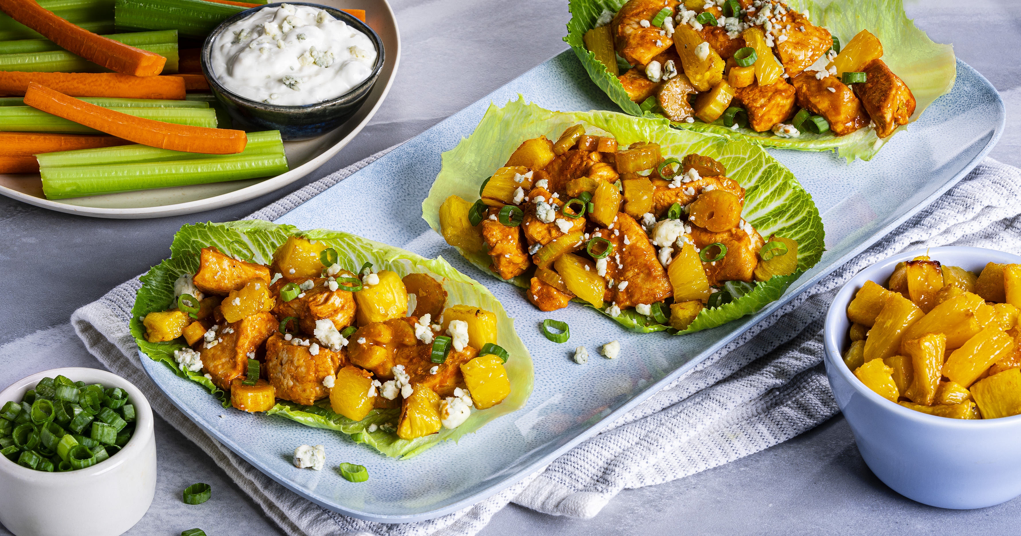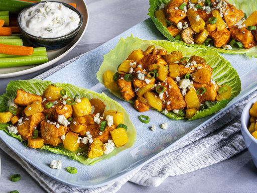 3. Arrange lettuce leaves on a serving platter. Fill leaves with chicken mixture, pineapple and green onions; sprinkle with blue cheese. Arrange celery and carrots sticks in the center of platter, if desired. Make 15 buffalo bites.