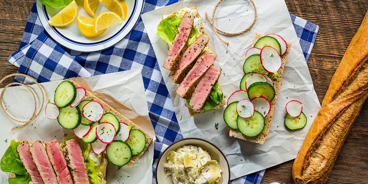 - Spread artichoke mixture on bottom halves of baguette; top with lettuce, tuna, cucumbers, radishes and top halves of baguette.