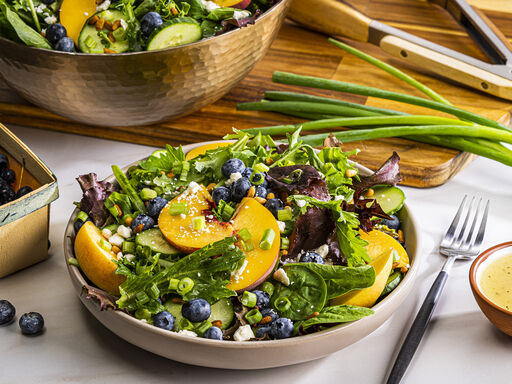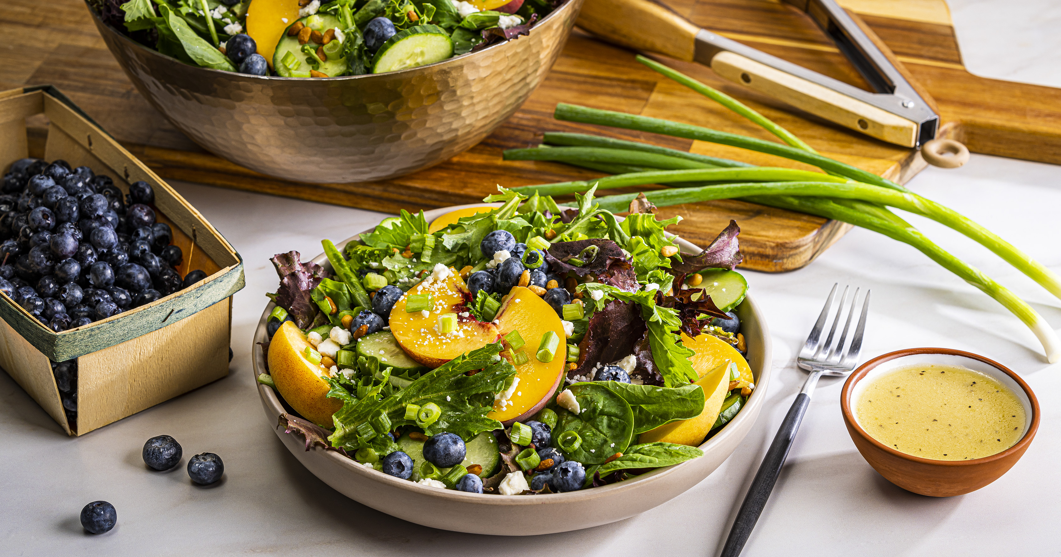 The green valleys of California have long been known for fresh produce and fruits, such as peaches, but only in recent years have they become a home to vast blueberry farms. Our California Summer Salad celebrates the culinary cornucopia that is the Golden State: fresh, tender greens tossed with sweet sliced peach and plump blueberries, plus crumbled feta, toasted pine nuts and sliced DOLE® Green Onion for some savory notes. Our white balsamic dressing is just what you’d expect to be served on a salad at one of the many fine restaurants that have popped up along with vineyard tasting rooms throughout the state. California dreaming right at your own table!