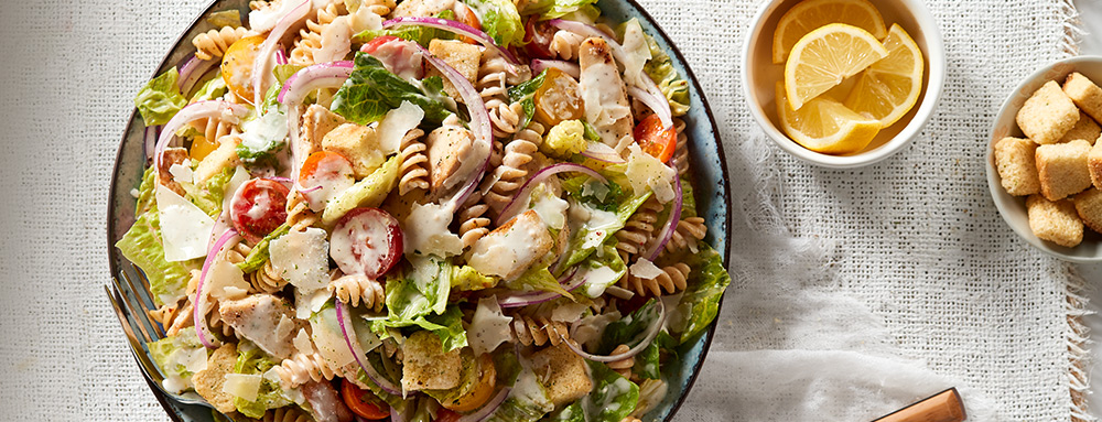 - Prepare Caesar Kit as package directs in a large bowl; fold in lemon juice, onion, tomatoes, pasta and chicken. Makes about 10 cups.