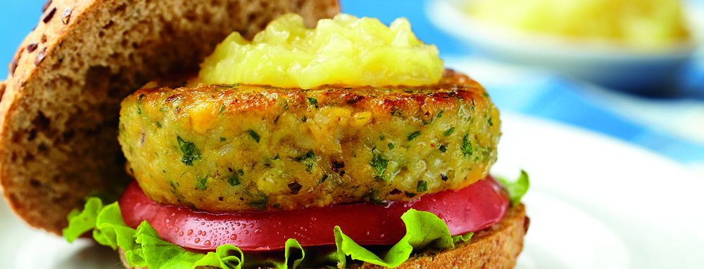 - Heat olive oil in a large nonstick skillet over medium heat. Cook burgers 5-7 minutes, turning halfway through. Serve on sandwich buns with tomato slices, lettuce and 1 tablespoon pineapple sauce on top of each burger.