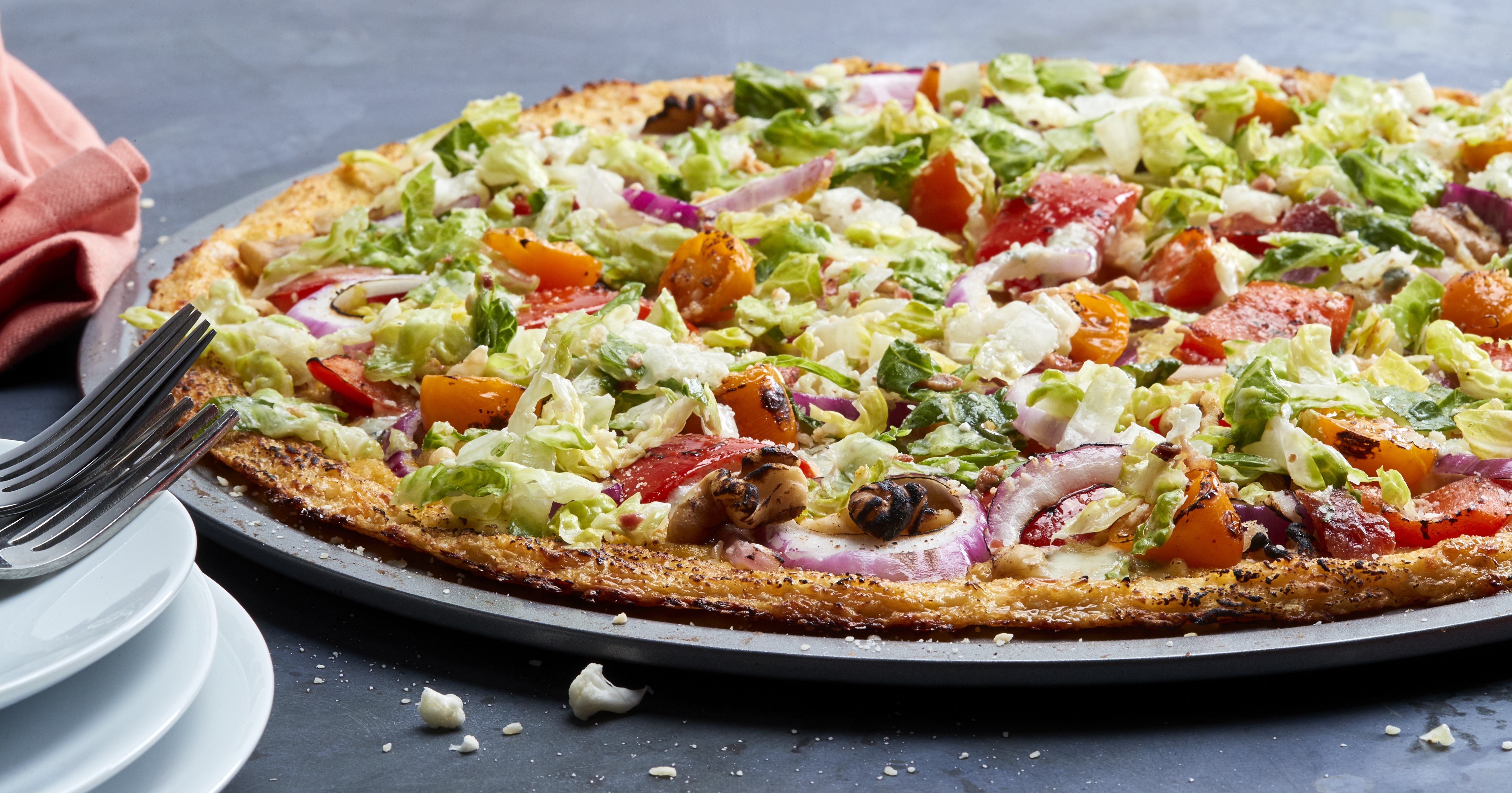 - Prepare salad kit as directed and spread out on top of warm crust.