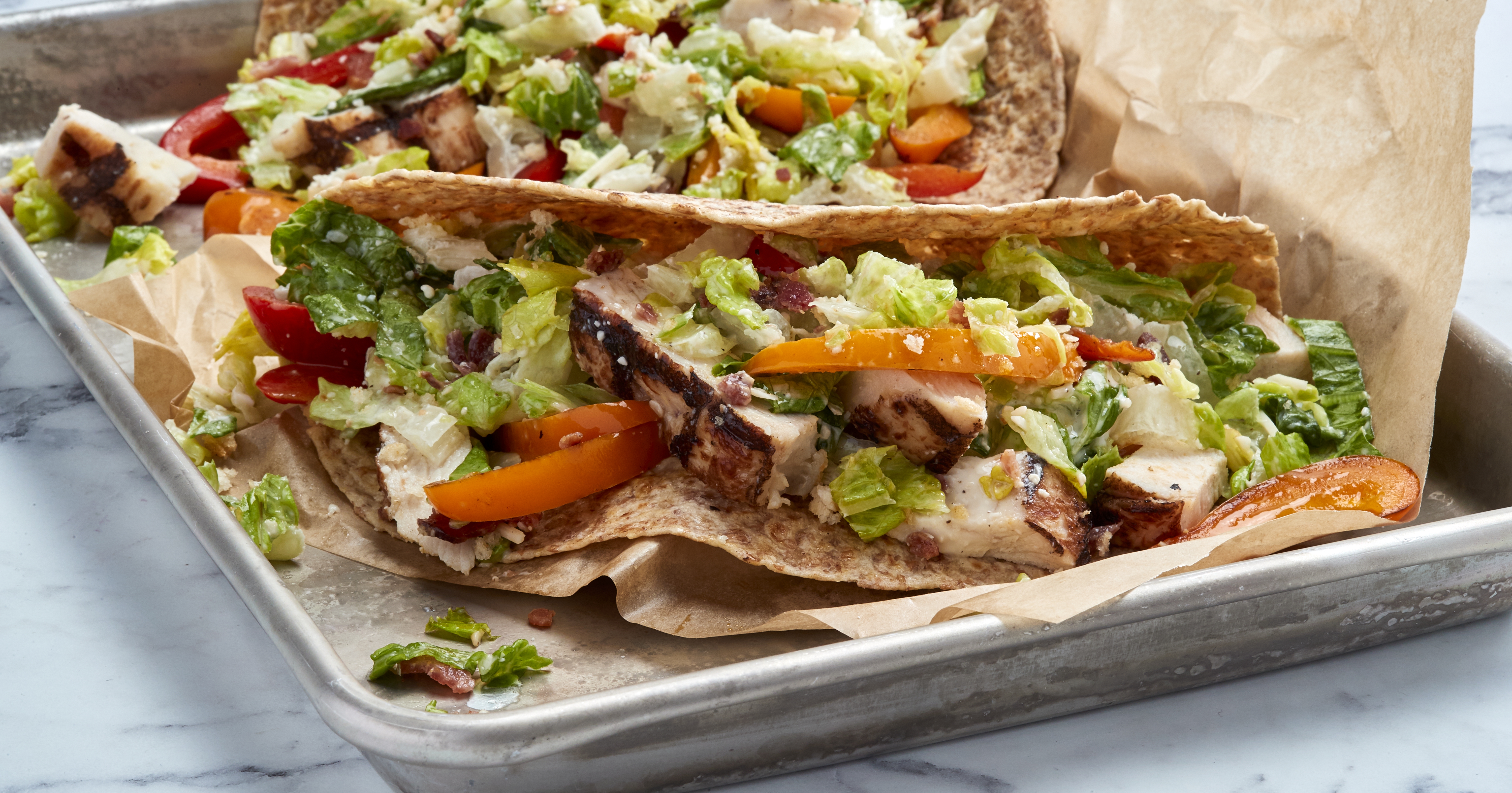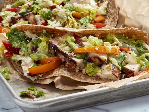 - Layer wraps with prepared salad, chicken and roasted peppers.