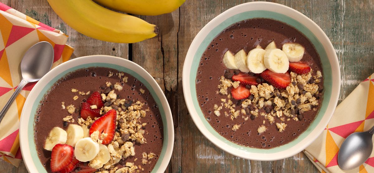 - Combine bananas, 1/4 cup almond butter, cocoa powder, acai pulp, 1 cup strawberries, and almond milk in blender container. Cover; blend until smooth. Divide the puree between four bowls.