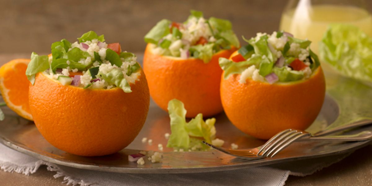Looking for a showstopper? This citrusy salad—filled with a refreshing blend of butter and baby red romaine lettuces, colorful veggies, chewy couscous and fragrant, chopped basil—presents beautifully in bright, hollowed rounds of orange. A feast for the senses, lunch is beautifully served.