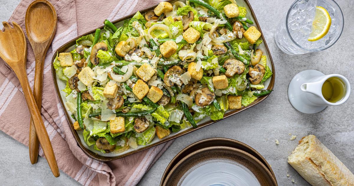 - Prepare Premium Kit as package directs in same large bowl reserving cheese and croutons. Add beans, onion and mushroom mixture; toss. Top salad with reserved cheese and croutons. Makes about 5 cups.