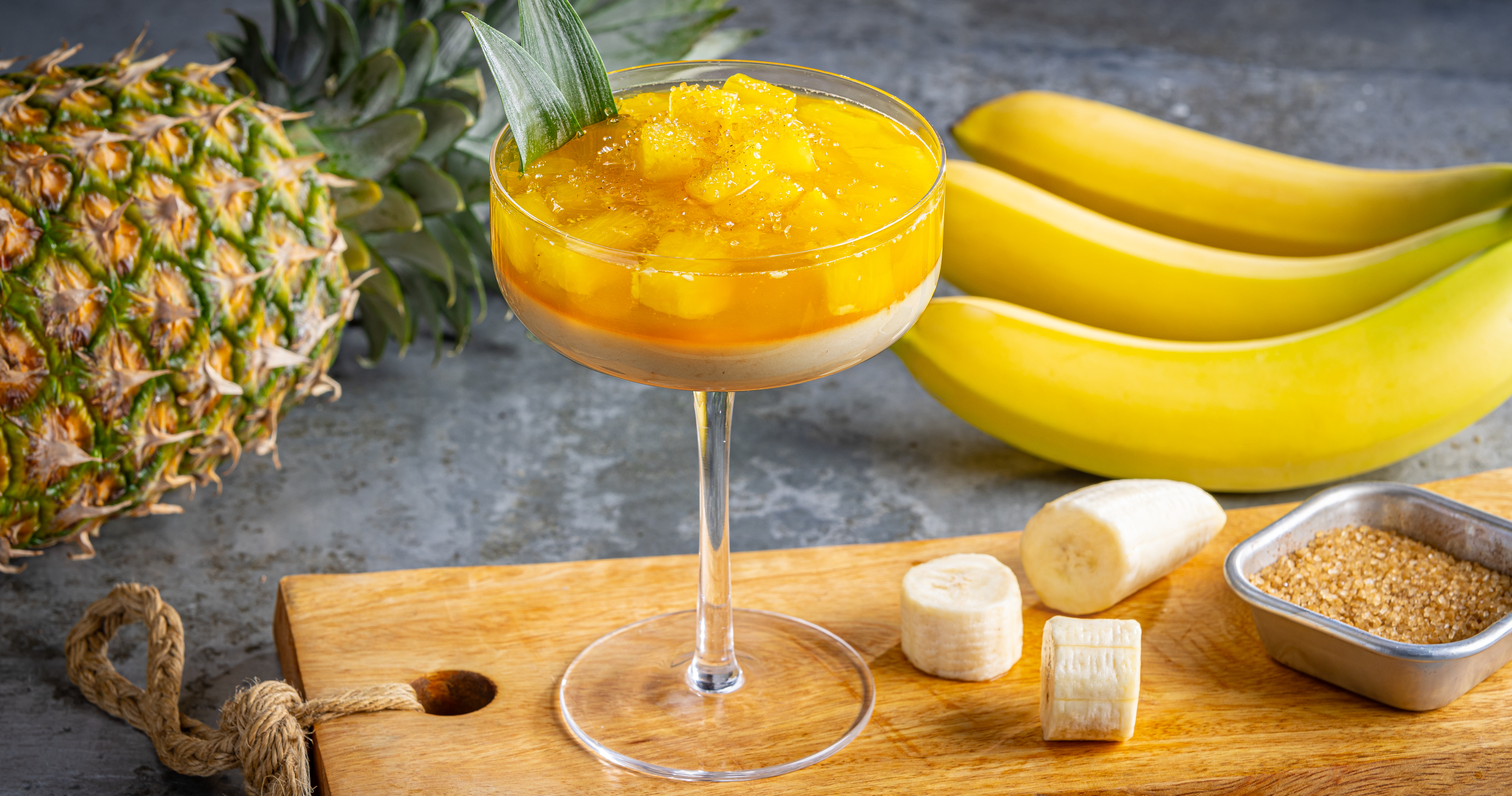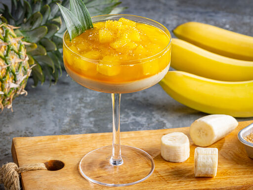 2. Stir milk and sugar in a small saucepot; heat to a boil over medium heat, stirring frequently. Whisk in unflavored gelatin mixture; remove from heat. Whisk in banana and sour cream; divide into 6 coupe glasses and refrigerate 2 hours or until firm.
