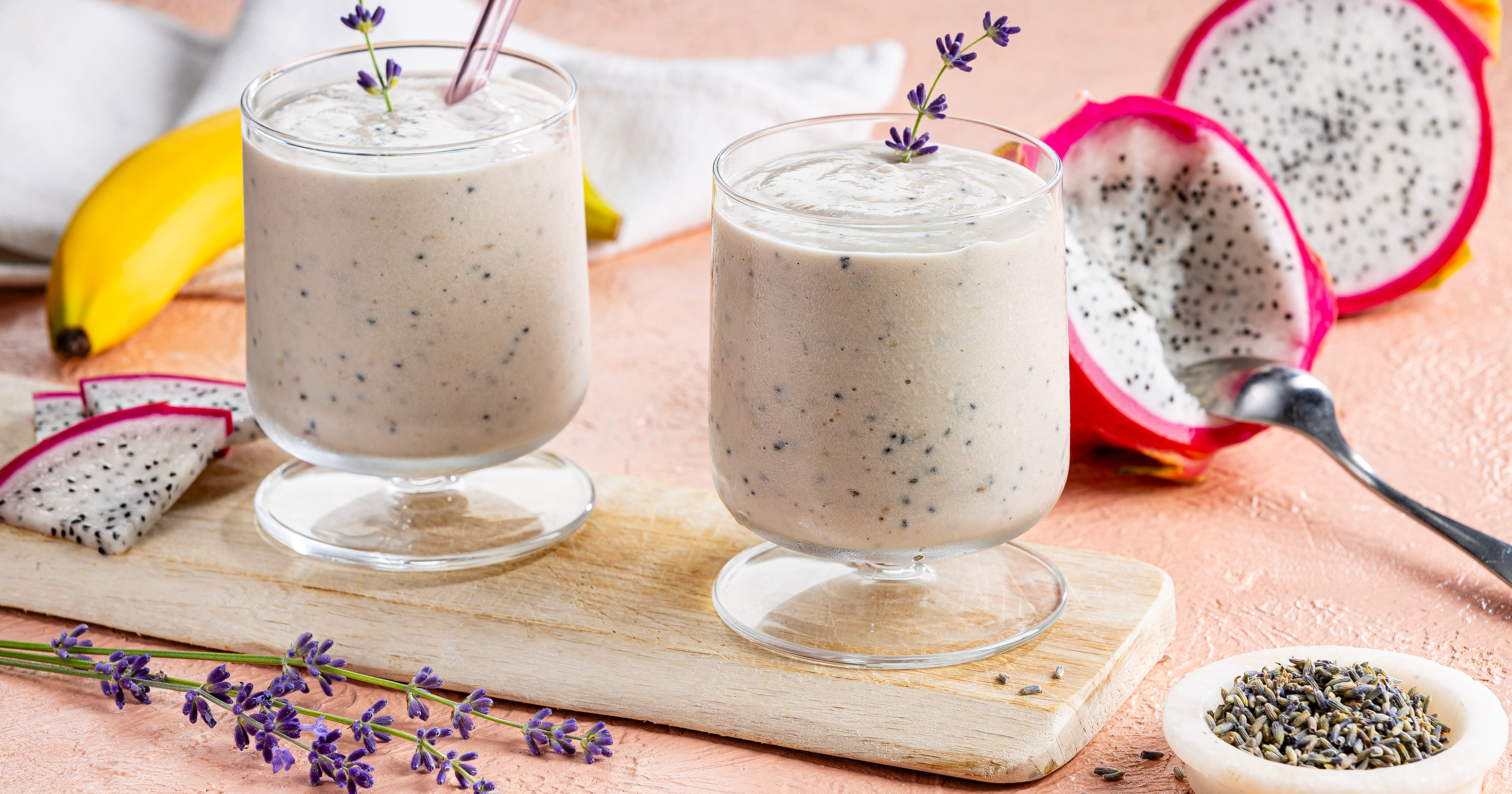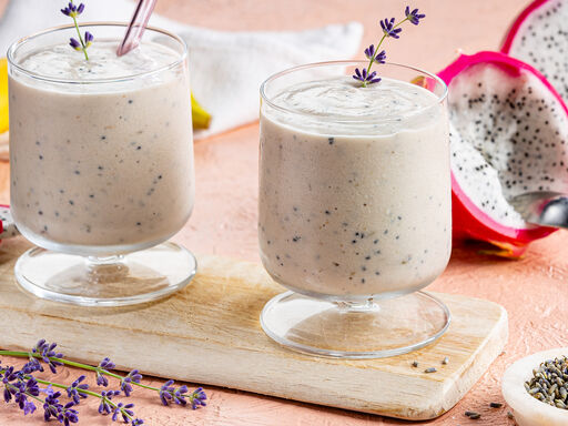 2. Purée milk, sugar, lavender, dragon fruits and banana in a blender on high until smooth. Makes about 4 cups.