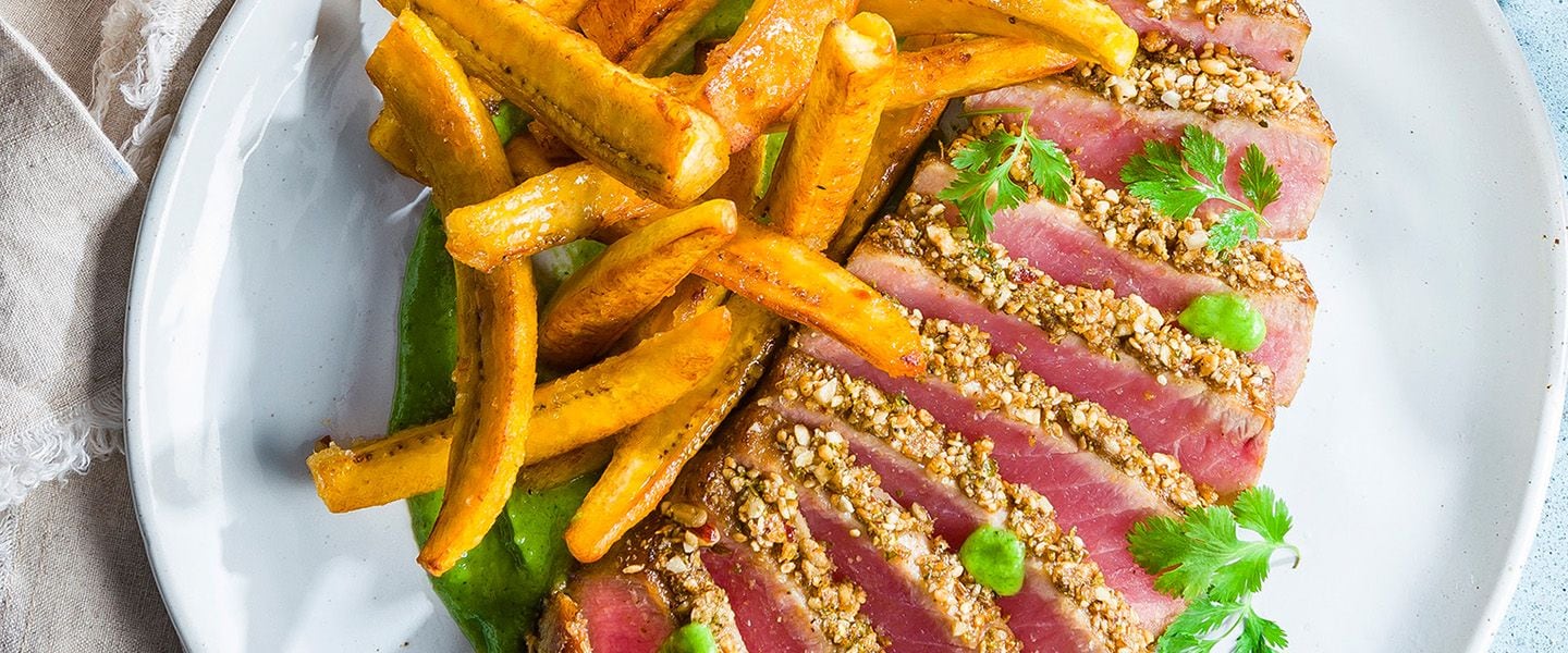 Dukkah Crusted Tuna with Kelewele Plantains