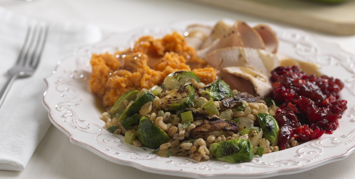 Farro, Caramelized Brussels Sprouts and Wild Mushroom Stuffing