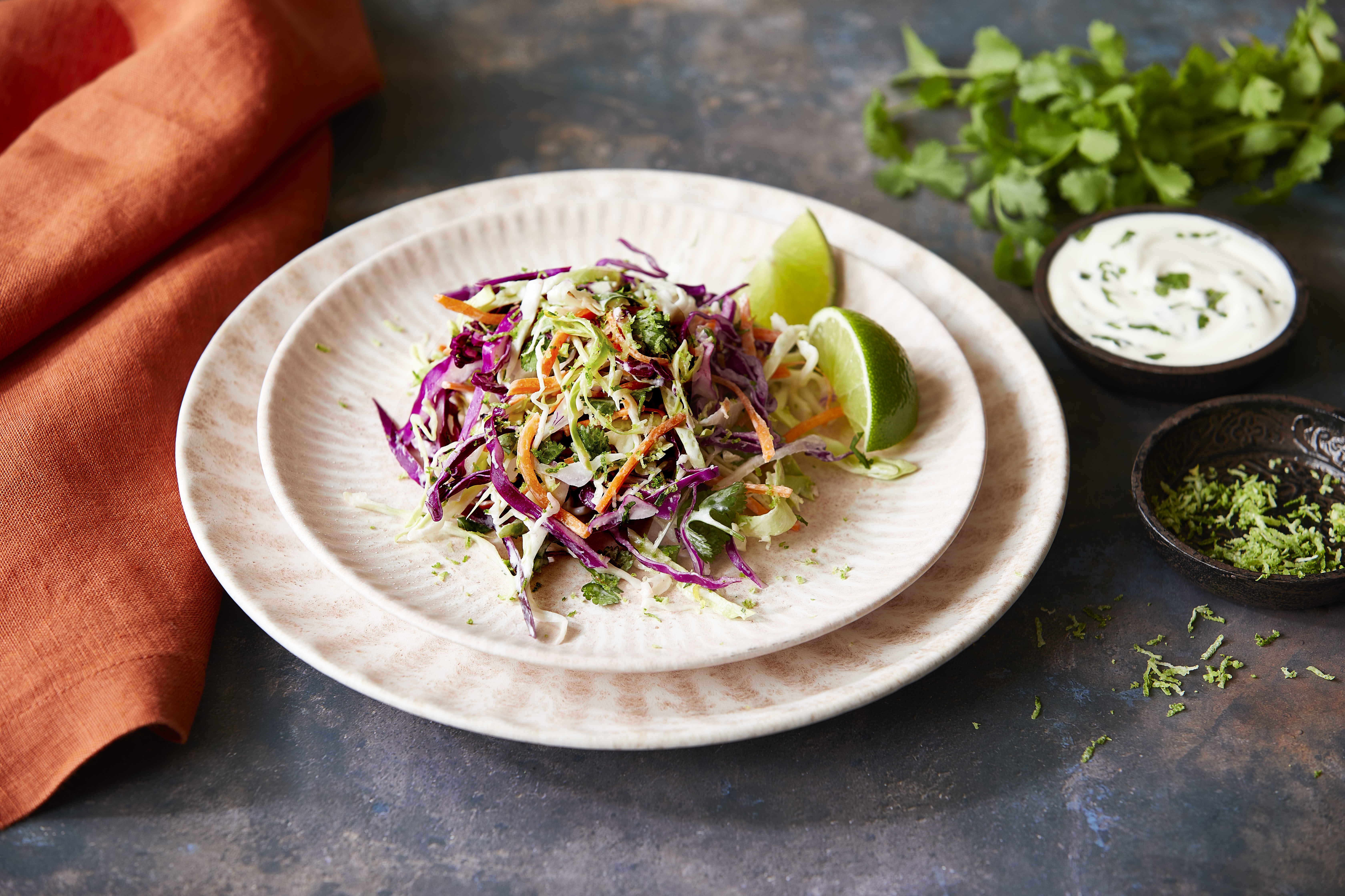 - Whisk lime juice, sour cream, vinegar, oil, cilantro, sugar, garlic powder and salt in a large bowl; fold in green cabbage, carrots, red cabbage and lime zest. Makes about 2½ cups.