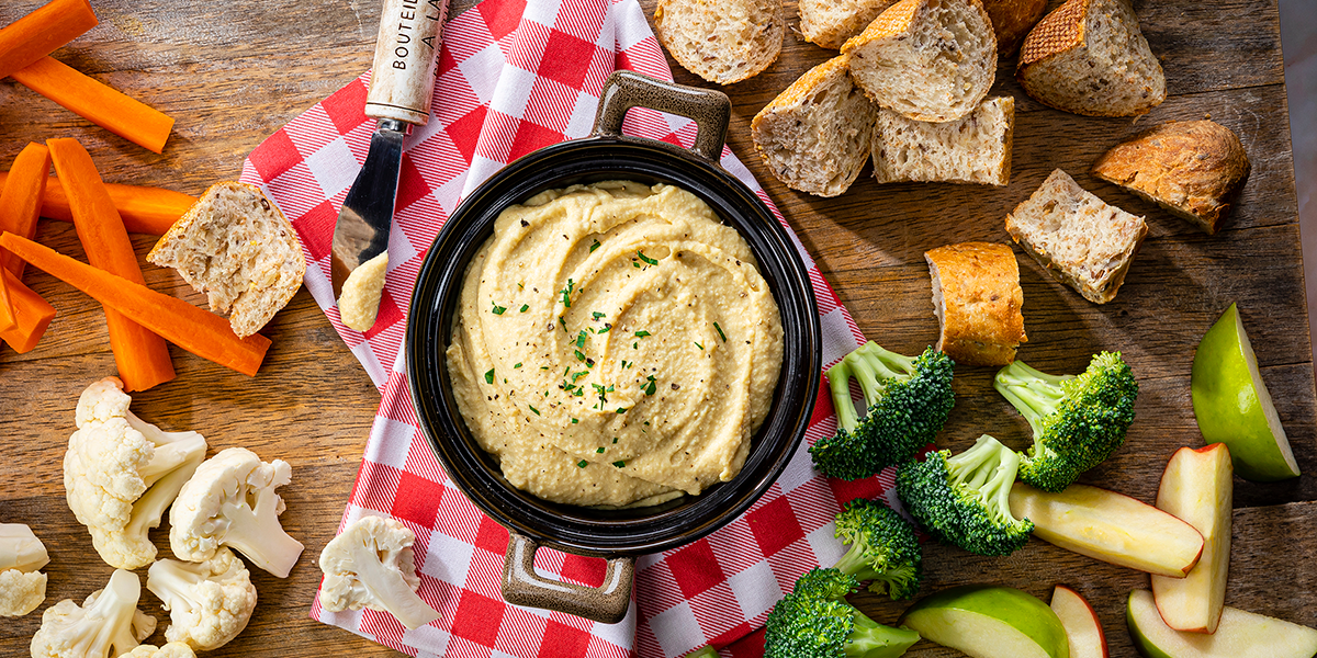 - Cool spread slightly and transfer to a small bowl; cover with plastic wrap, pressing wrap onto surface. Invert spread in center of a large serving plate; arrange broccoli, cauliflower, carrots, apple and baguette around spread.