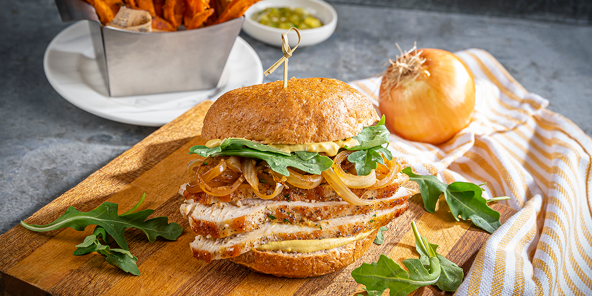 - Spread mustard on cut sides of bottom buns; top with turkey, onions, arugula and top bun.