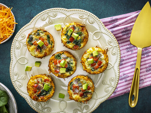 - Press about ¼ cup potato mixture onto bottom and up sides of each cup. Bake cups 20 minutes or until golden brown; reduce oven temperature to 375°F.