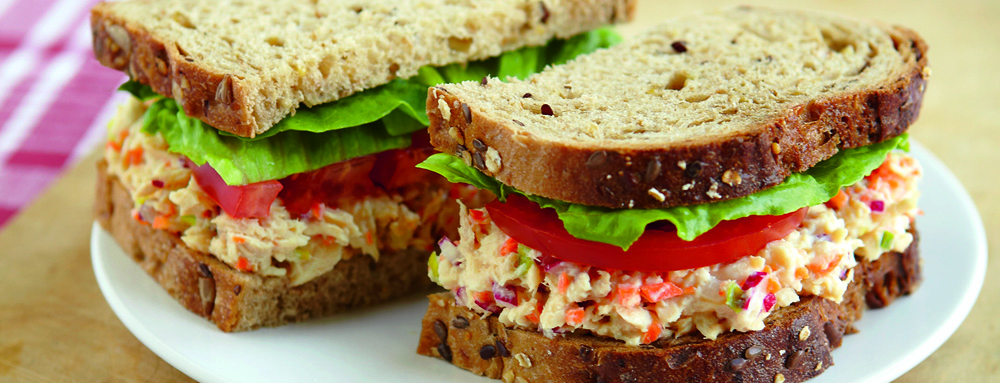 - Divide mixture among 4 slices of bread and top with sliced tomato (if using), lettuce leaves, and remaining bread slice.