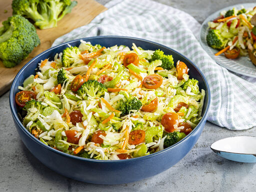 - Combine coleslaw, broccoli, celery and tomatoes, in large serving bowl.