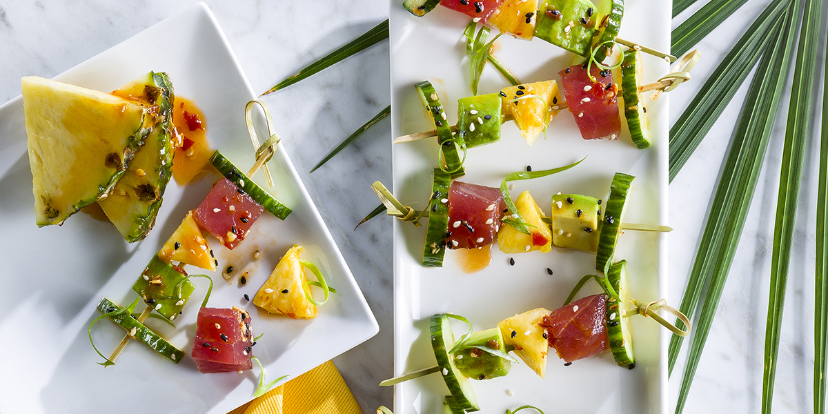 - Thread 1 piece tuna, cucumber, pineapple, and avocado onto each skewer; place in shallow baking dish.