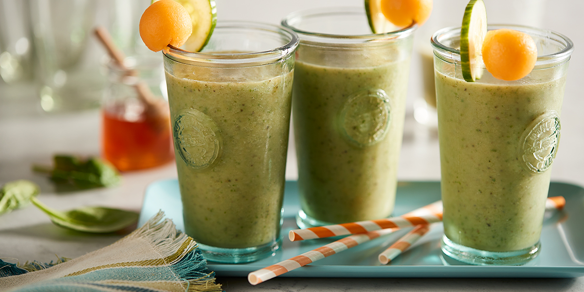 - Purée all ingredients in a blender on high until smooth; serve garnished with cantaloupe and cucumber, if desired. Makes about 5 cups.