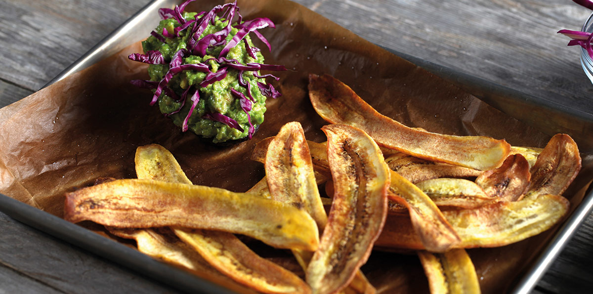 - 1 DOLE® Plantain, green starting to turn yellow, peeled and thinly sliced lengthwise