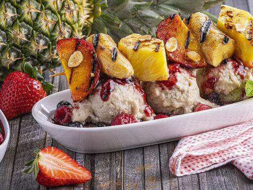 - Arrange skewers on serving plates with a scoop of the frozen banana, a spoonful of Fresh Berry Sauce, a sprinkling of almonds and mint.
