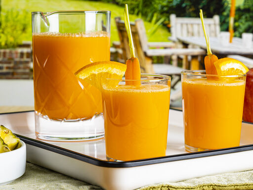 - Process all ingredients through a juicer; serve immediately garnished with carrots and pineapple wedges, if desired. Makes about 2¾ cups.