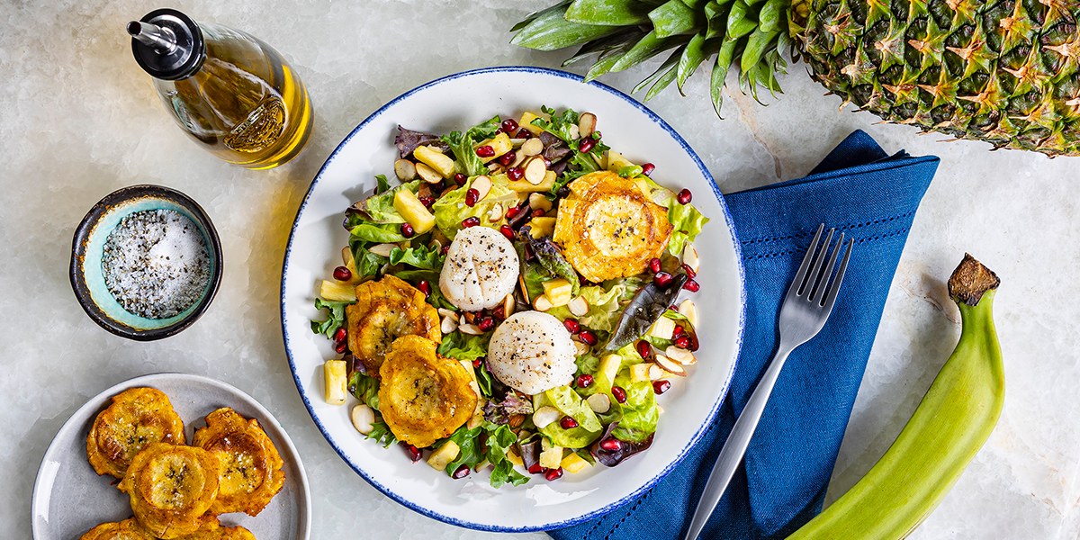 - Serve salad topped with plantains and scallops drizzled with remaining 1 tablespoon cooking oil, if desired.